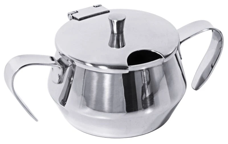 Zuckerdose, aus Edelstahl 18/10, hochglänzend, mit Löffelausschnitt im Einhandklappdeckel, schwere Qualität