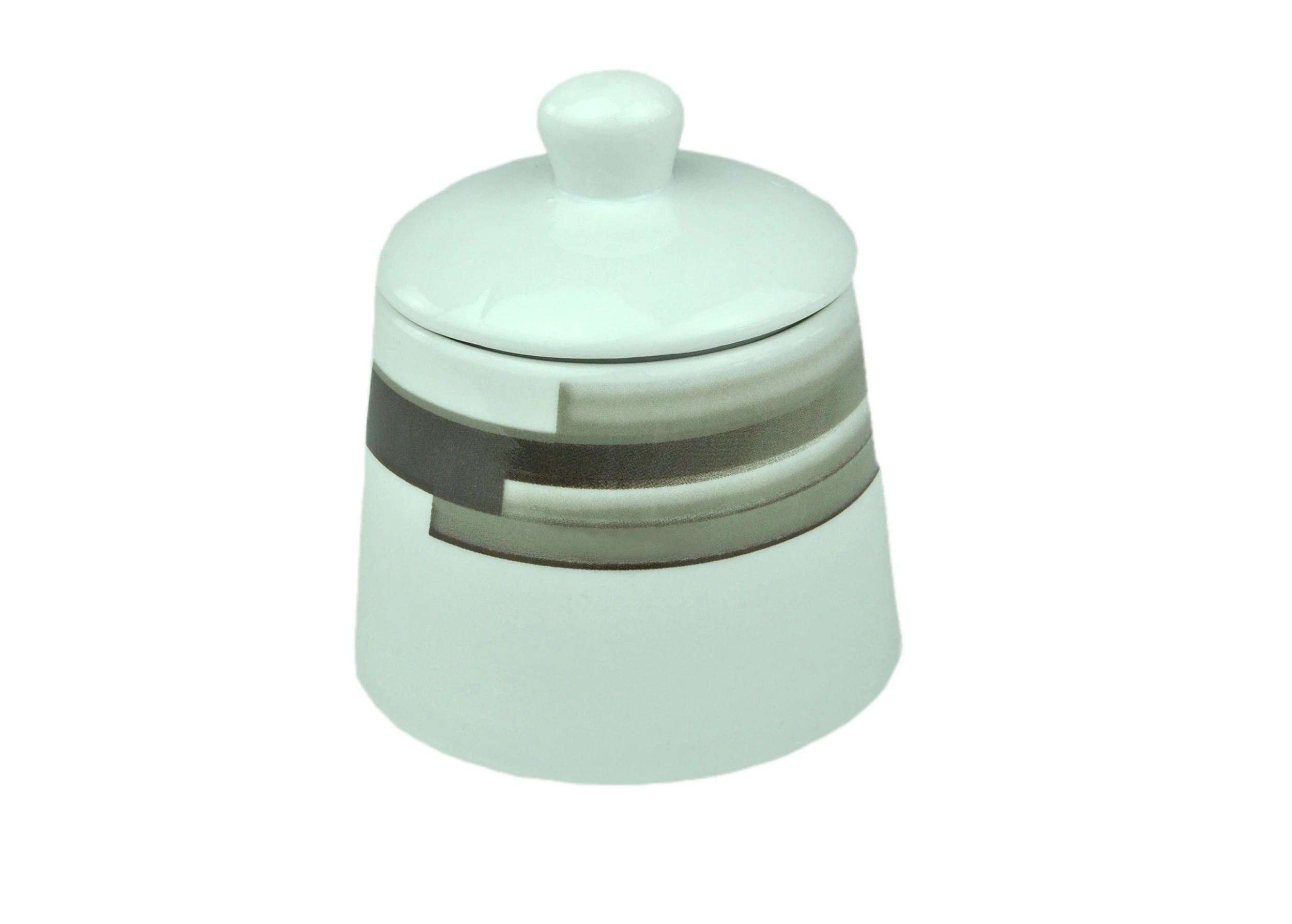 Beide Porzellanbehälter aus dem Hause Van Well zieren verwaschene und wild aneinander-gereihte Streifen in dunklem Braun. Setzen auch Sie trendige Akzente bei Tisch.