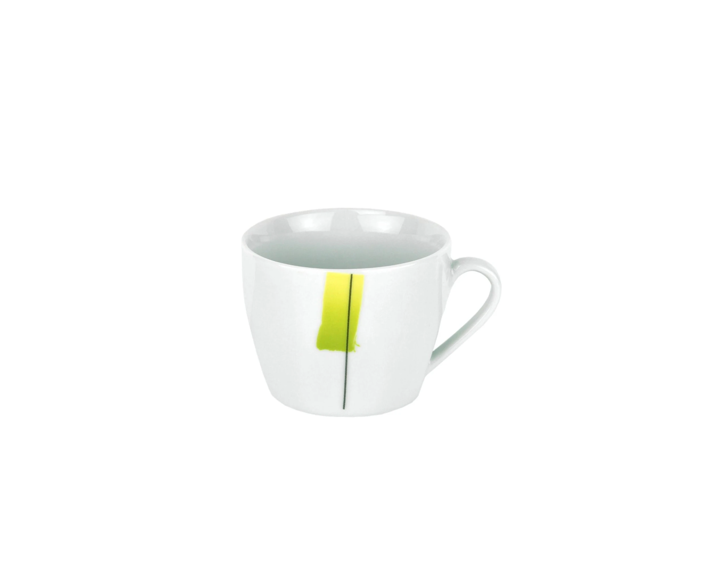 Auf dem weißen Porzellan kommt das stilvolle Dekor besonders gut zur Geltung. Es setzt sich aus mehreren Elementen zusammen: grüngelben Farbtupfer, senkrechten Linien in schwarz und grüngelb sowie kleinen, schwarzen Streifen am Rand des Untertellers.