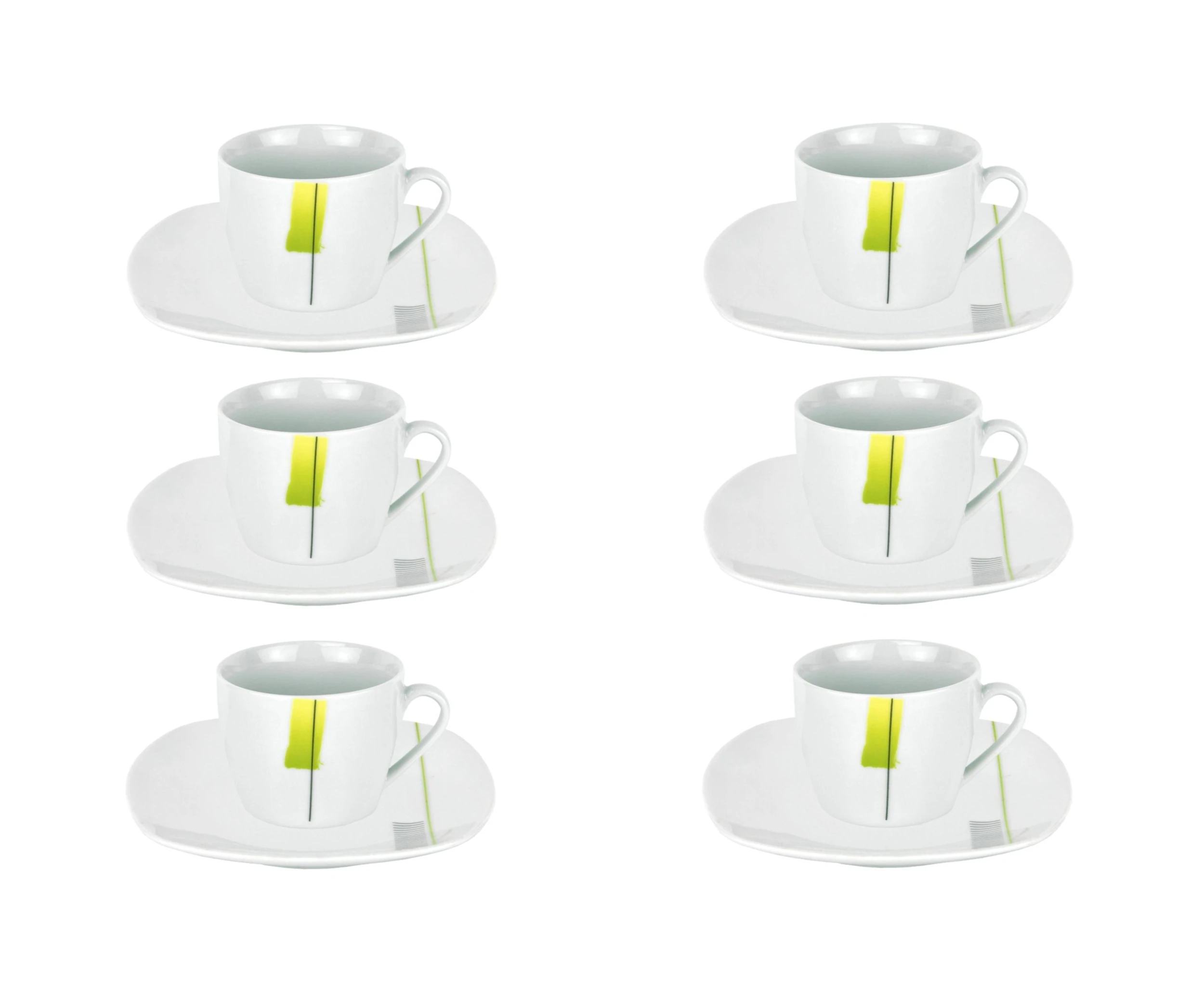 Auf dem weißen Porzellan kommt das stilvolle Dekor besonders gut zur Geltung. Es setzt sich aus mehreren Elementen zusammen: grüngelben Farbtupfer, senkrechten Linien in schwarz und grüngelb sowie kleinen, schwarzen Streifen am Rand des Untertellers.